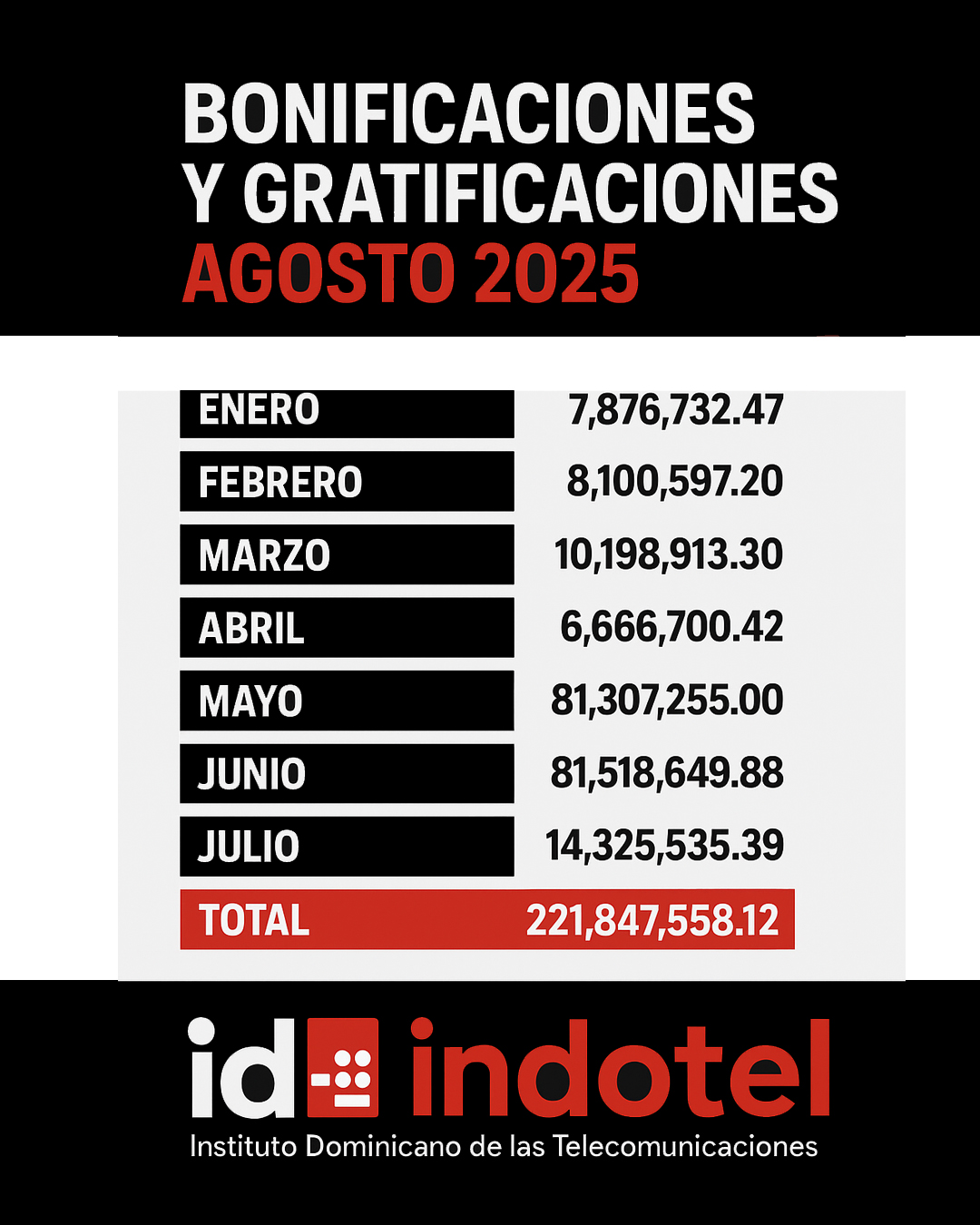 El Instituto Dominicano de las Telecomunicaciones (INDOTEL) gastó en mayo y junio de 2025 un total de RD$162.8 millones en gratificaciones y bonificaciones, una cifra que llama la atención.