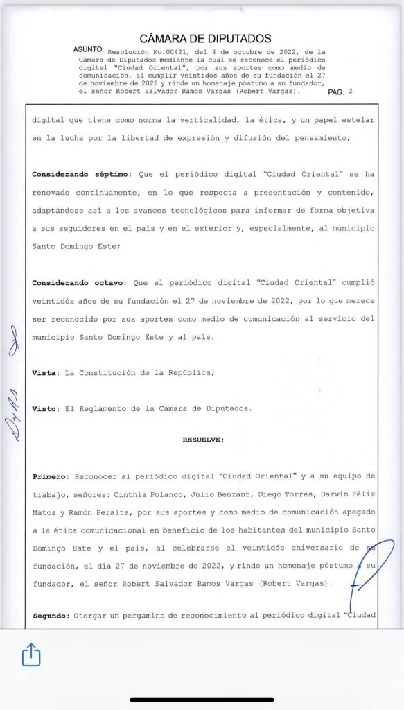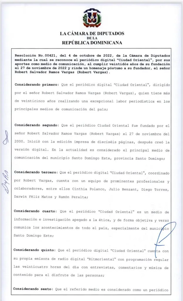 La Cámara de Diputados reconocerá el periódico digital “Ciudad Oriental”, por sus aportes como medio de comunicación, al cumplir veintidós años de su fundación el 27 de noviembre de 2022 y rendirá un homenaje póstumo a su fundador Robert Salvador Ramos Vargas mejor conocido como (Robert Vargas).