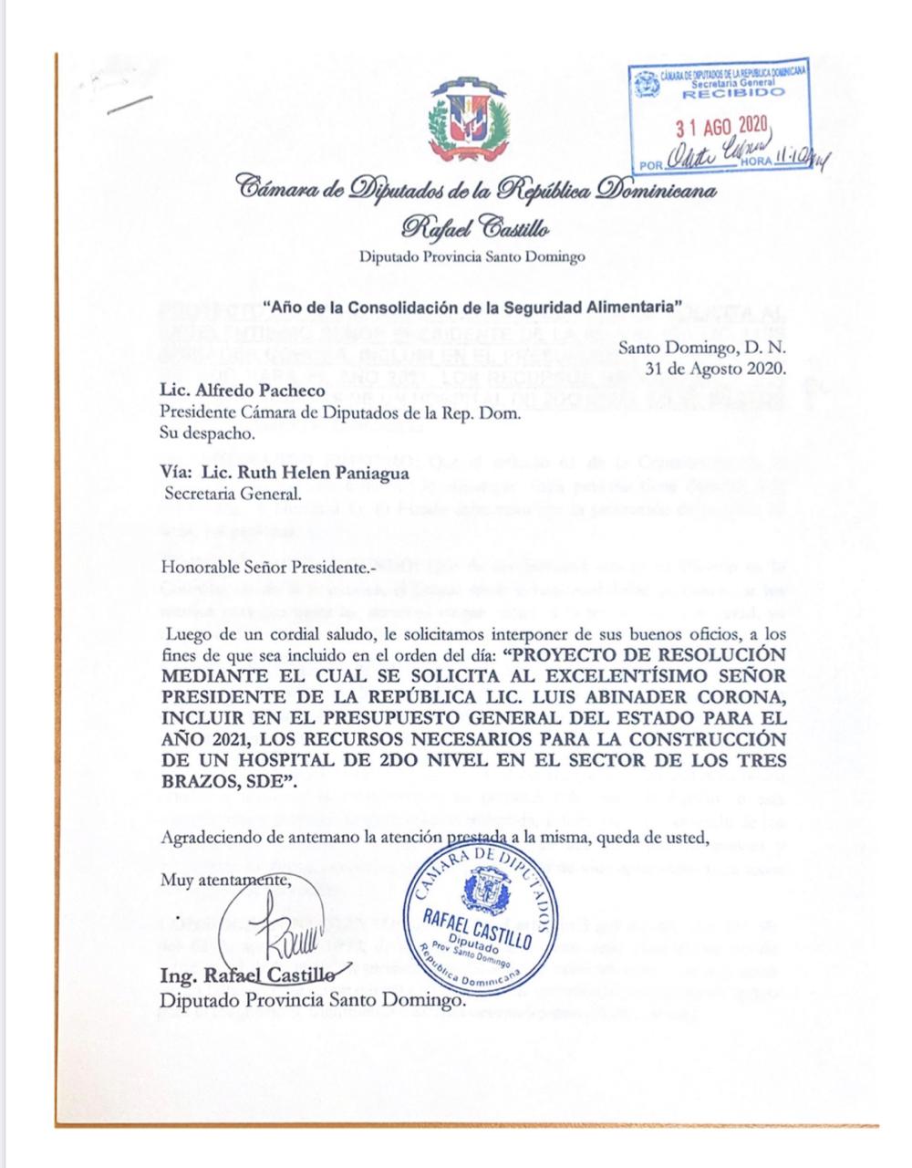 El diputado por la circunscripción número 2 de Santo Domingo Este, del Partido de la Liberación Dominicana (PLD), Rafael Castillo solicitó la construcción de un polideportivo y un hospital general en el sector Los Tres Brazos.