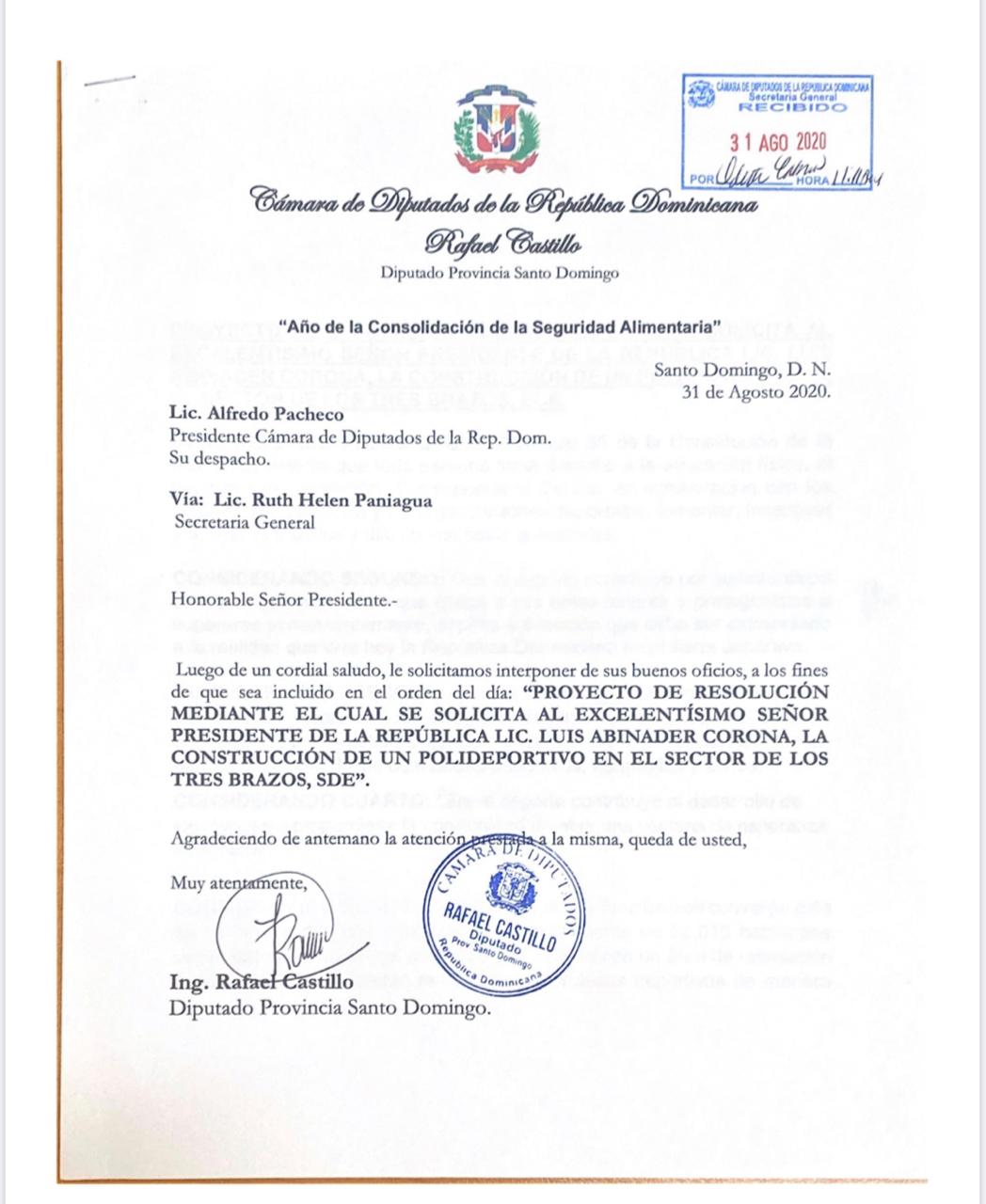 El diputado por la circunscripción número 2 de Santo Domingo Este, del Partido de la Liberación Dominicana (PLD), Rafael Castillo solicitó la construcción de un polideportivo y un hospital general en el sector Los Tres Brazos.