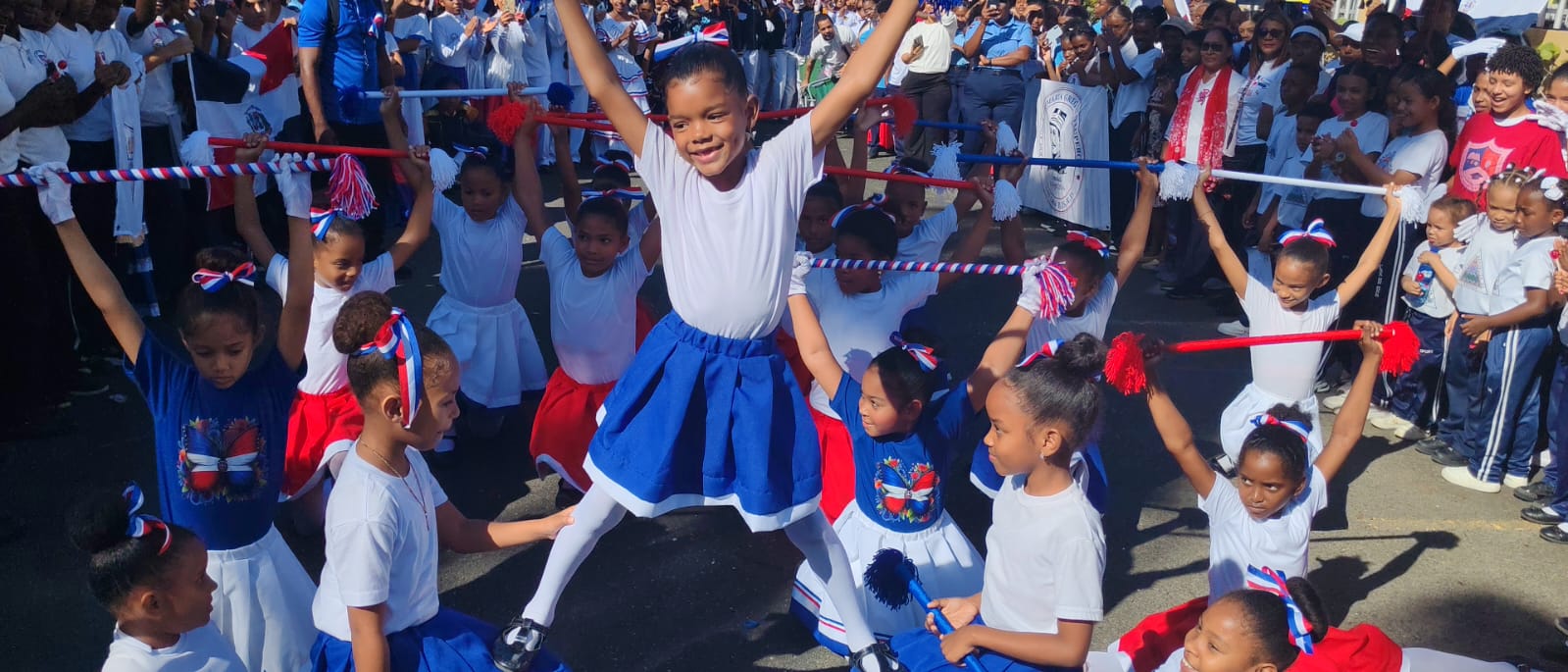 Con abanderados al frente y portando la Bandera Nacional, los estudiantes realizaron presentaciones que incluyeron dramatizaciones de la gesta histórica, poemas alegóricos, marchas y cánticos. Además, contagiaron a los asistentes con la música folclórica que identifica a los dominicanos: el merengue.