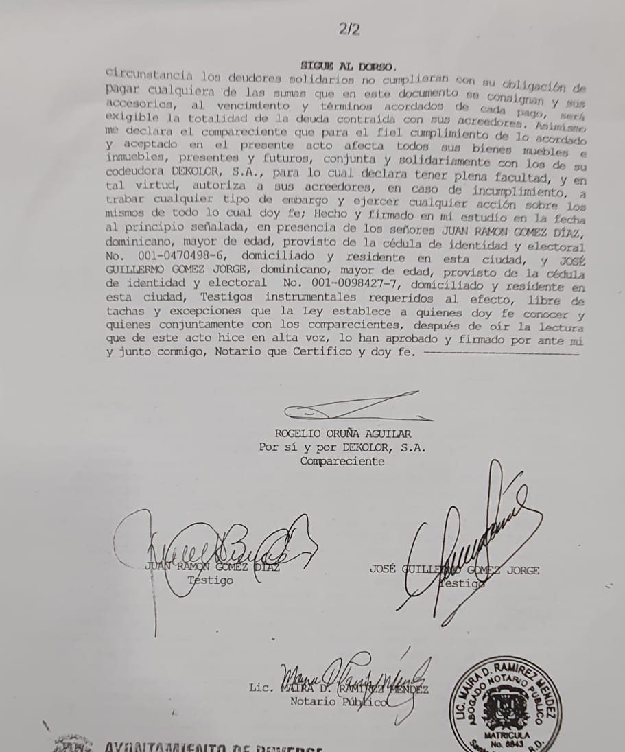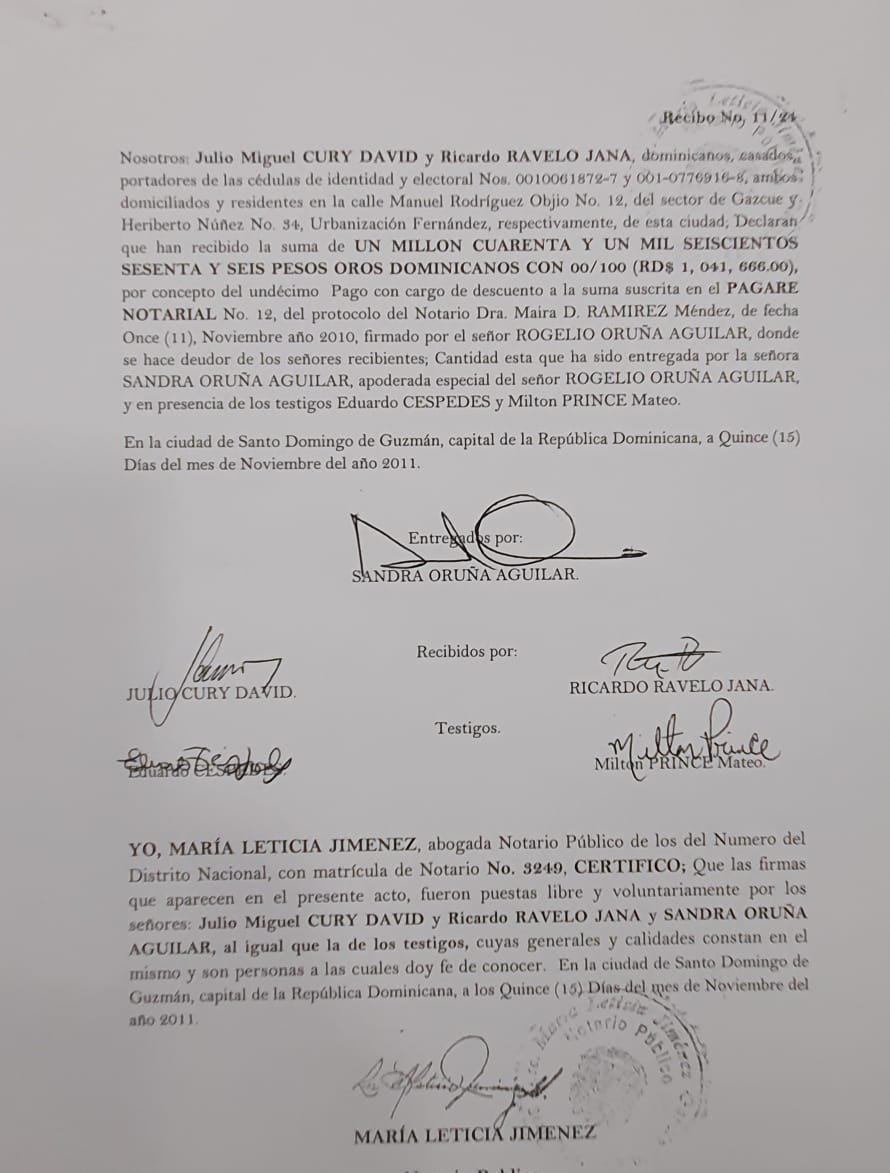En la sentencia No. 67 se hacen constar los documentos que fueron depositados, y consigna además que con la indemnización pagada a Cury, que ascendió a 33 millones de pesos, equivalentes entonces a un millón de dólares, tal como consta en documentos a los que tuvo acceso este medio, se puso fin a “todos y cada uno de los conflictos judiciales existentes y por existir” entre las partes, y en cambio de esa millonaria suma de dinero que se le pagó al jurista, éste se comprometió a no presentar “ninguna acción judicial de cualquier naturaleza” en contra de Oruña.
