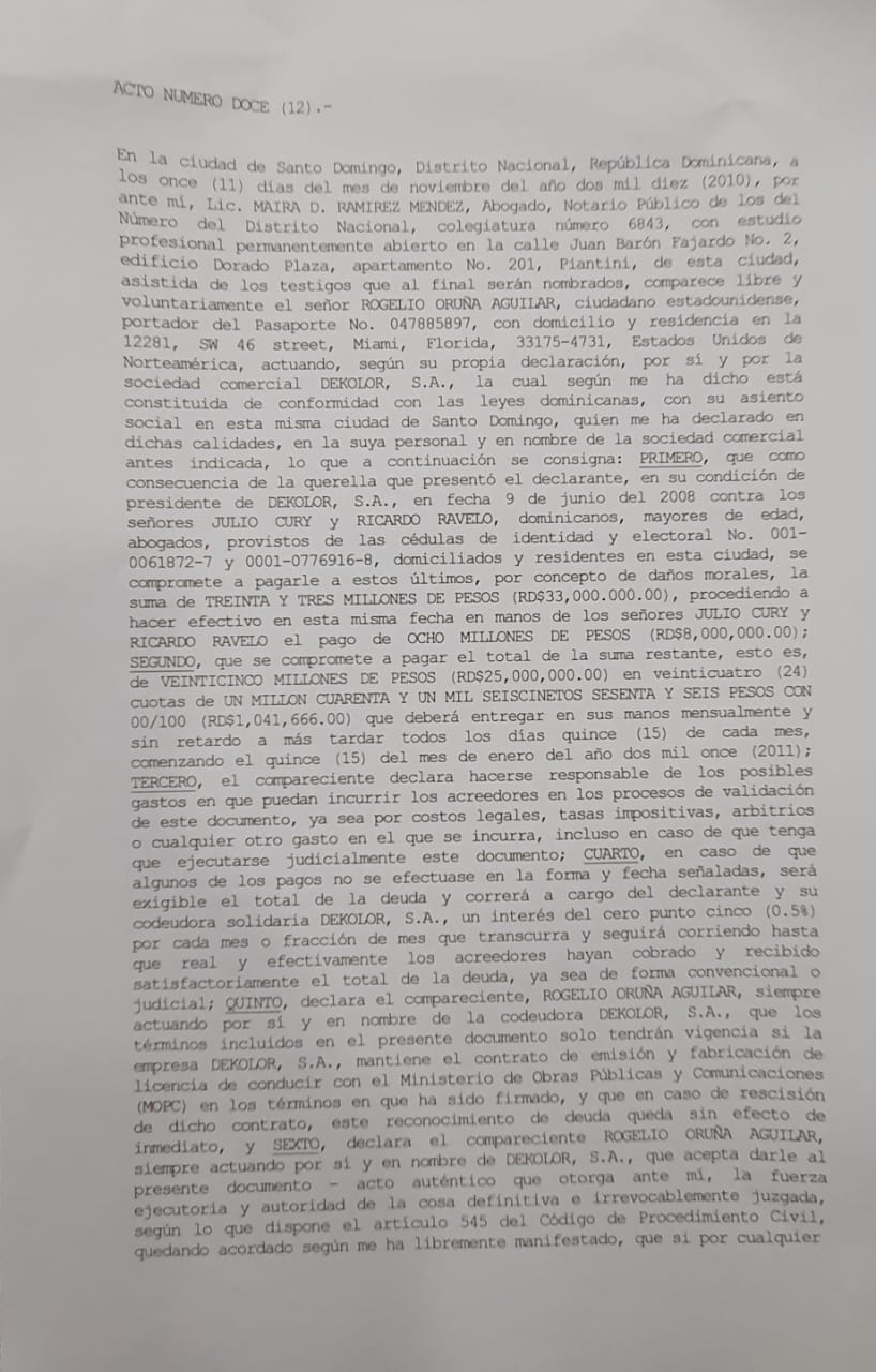En la sentencia No. 67 se hacen constar los documentos que fueron depositados, y consigna además que con la indemnización pagada a Cury, que ascendió a 33 millones de pesos, equivalentes entonces a un millón de dólares, tal como consta en documentos a los que tuvo acceso este medio, se puso fin a “todos y cada uno de los conflictos judiciales existentes y por existir” entre las partes, y en cambio de esa millonaria suma de dinero que se le pagó al jurista, éste se comprometió a no presentar “ninguna acción judicial de cualquier naturaleza” en contra de Oruña.