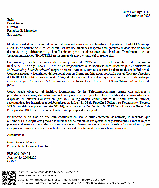 El presidente del Consejo Directivo del Instituto Dominicano de las Telecomunicaciones (INDOTEL), Guido Gómez Mazara, confirmó que durante los meses de mayo y junio de 2025 la institución realizó pagos por concepto de bonificaciones e incentivos a su personal, en respuesta a informaciones publicadas por el periódico El Munícipe el pasado 15 de octubre.