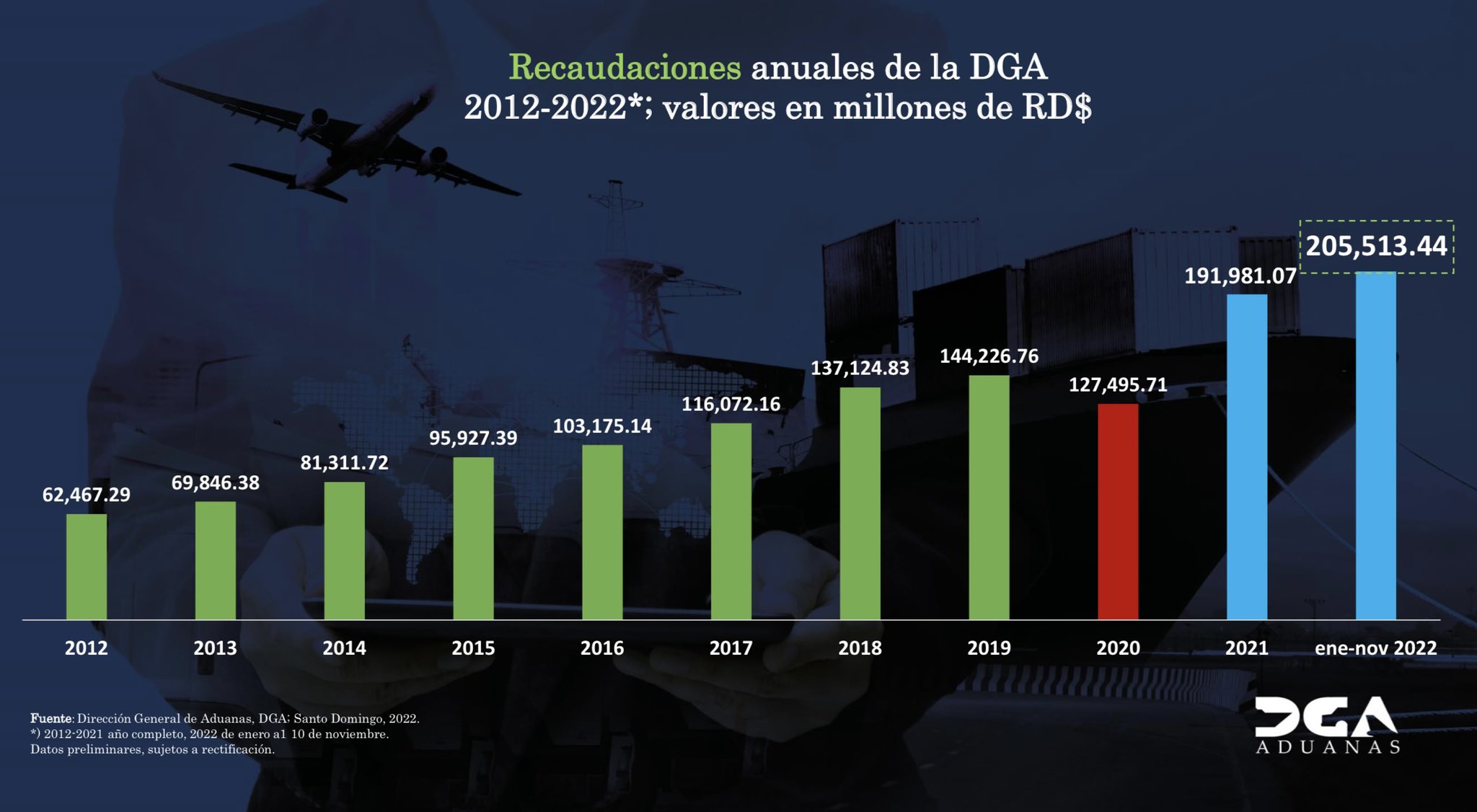 Sanz Lovatón señaló que durante el año 2021, la institución recaudó unos RD$192 mil millones, mientras que a noviembre del 2022 los ingresos ascendieron a RD$205,513.44 millones, lo que significa que en este año habrá un nuevo record en recaudaciones aduanales en la historia del país.